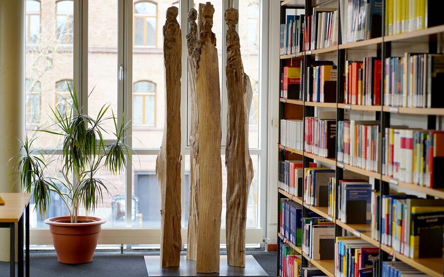 Für die Skulptur, die den Titel „Forum“ trägt, hat der Aschaffenburger Bildhauer Konrad Franz aus dem Stamm einer Linde mit der Axt vier Individuen herausgearbeitet. Wo Menschen sich treffen, seien ein Austausch und eine gegenseitige Inspiration möglich, erklärt der Künstler seine Idee. Durch die Begegnung und das Gespräch miteinander könnten Erkenntnisse gewonnen werden, etwas Neues entstehen und sich weiterentwickeln. Daher wurde für das Kunstwerk in der Bibliothek als einem zentralen Ort der Begegnung an der Technischen Hochschule ein passender Platz gefunden.