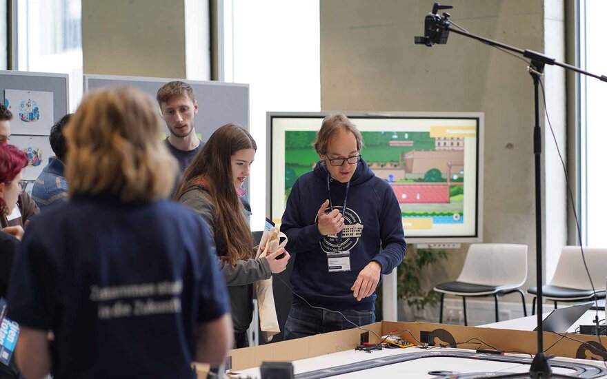 Studierende aus dem Studiengang Software Design stellten ein Projekt vor und luden die Besucherinnen und Besucher dazu ein, mit einem ferngesteuerten Mini-Auto auf einer Carrera-Bahn in einem Wettrennen gegen ein KI-gesteuertes Modellauto anzutreten.