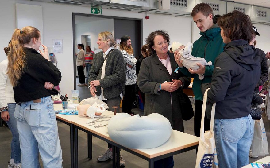 • An den Ständen der Fakultät Gesundheit und Soziales schauten sich Interessierte unter anderem eine Babypuppe an, die für die praktische Ausbildung im Hebammenstudium eingesetzt wird.