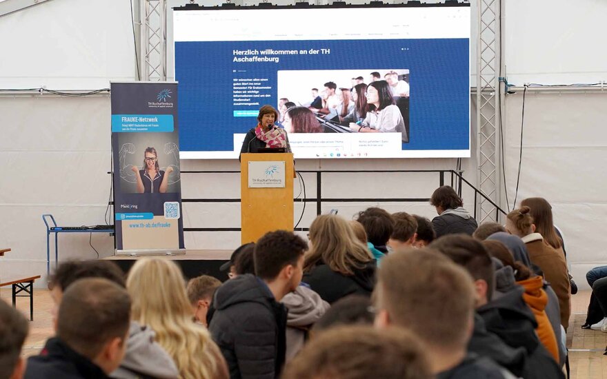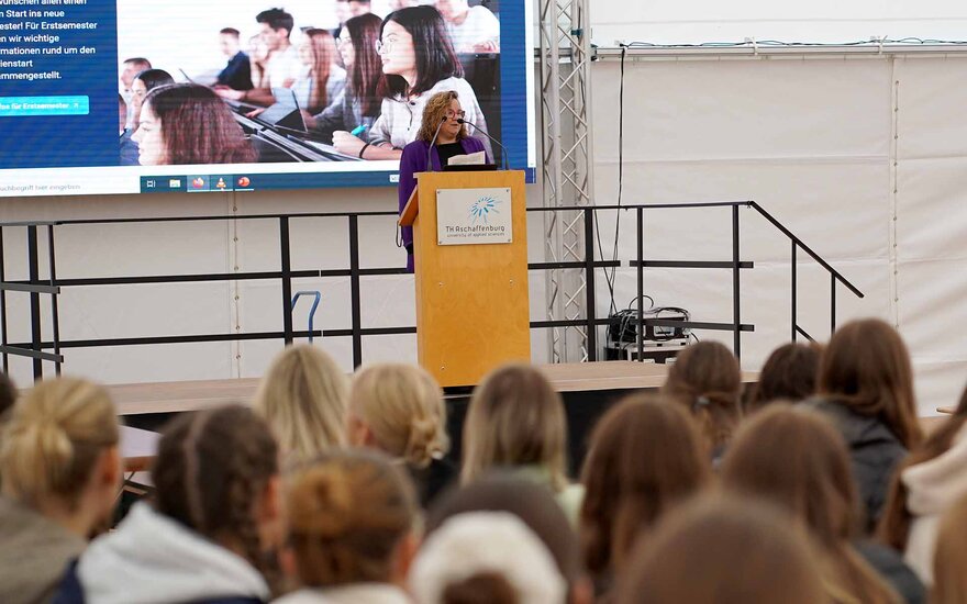 • Prof. Dr. Eva-Maria Beck-Meuth, Präsidentin der TH Aschaffenburg, begrüßt die neuen Studierenden auf dem Campus