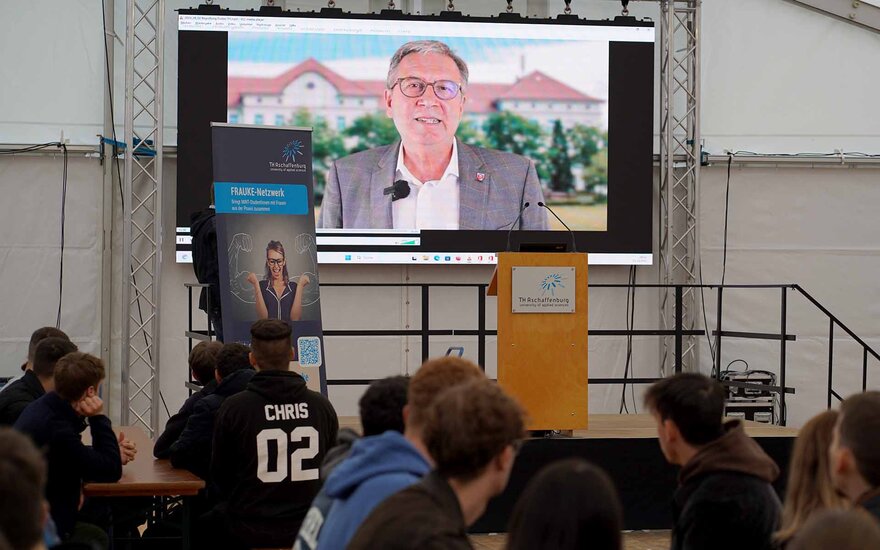 Der Aschaffenburger Oberbürgermeister Jürgen Herzing wünschte den Studierenden per Videobotschaft ebenfalls einen guten Studienstart. „Viele von Ihnen sind hier verwurzelt. Es gibt gute Chancen auf dem Arbeitsmarkt, es gibt gute Arbeitsplätze und die Lebensqualität ist hier am Bayerischen Untermain sehr, sehr gut […]“, so seine motivierenden Worte an die Erstsemester.