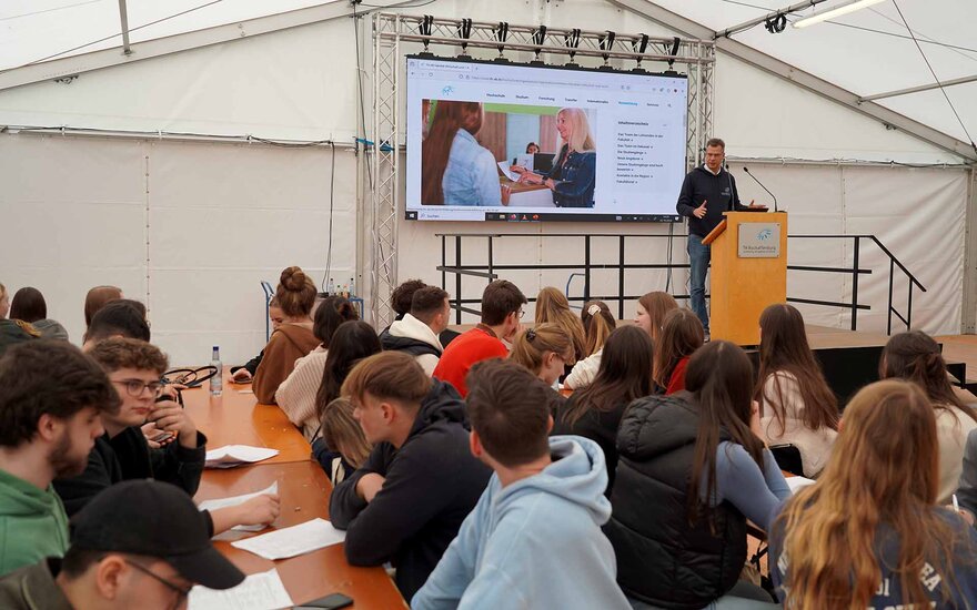 • Prof. Dr. Ivo Schäfer, Vizepräsident für Studium, Lehre und Internationales und Professor an der Fakultät Wirtschaft und Recht stellt den neuen Studierenden letztere vor