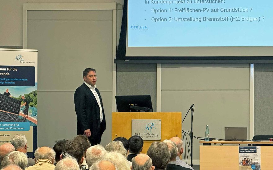 Im abschließenden Vortrag präsentierte Professor Mann ein weiteres Kooperationsprojekt mit regionalen Unternehmen aus dem Landkreis Aschaffenburg. Er zeigte, welche Einsparpotenziale sich durch eine bedarfsorientierte Auslegung von PV- und Speichersystemen ergeben. Grundlage sind präzise Verbrauchsanalysen und Simulationen verschiedener Anlagenkonfigurationen. Ziel ist es, sowohl CO2-Emissionen zu reduzieren als auch die Energiekosten der Projektpartner zu minimieren.