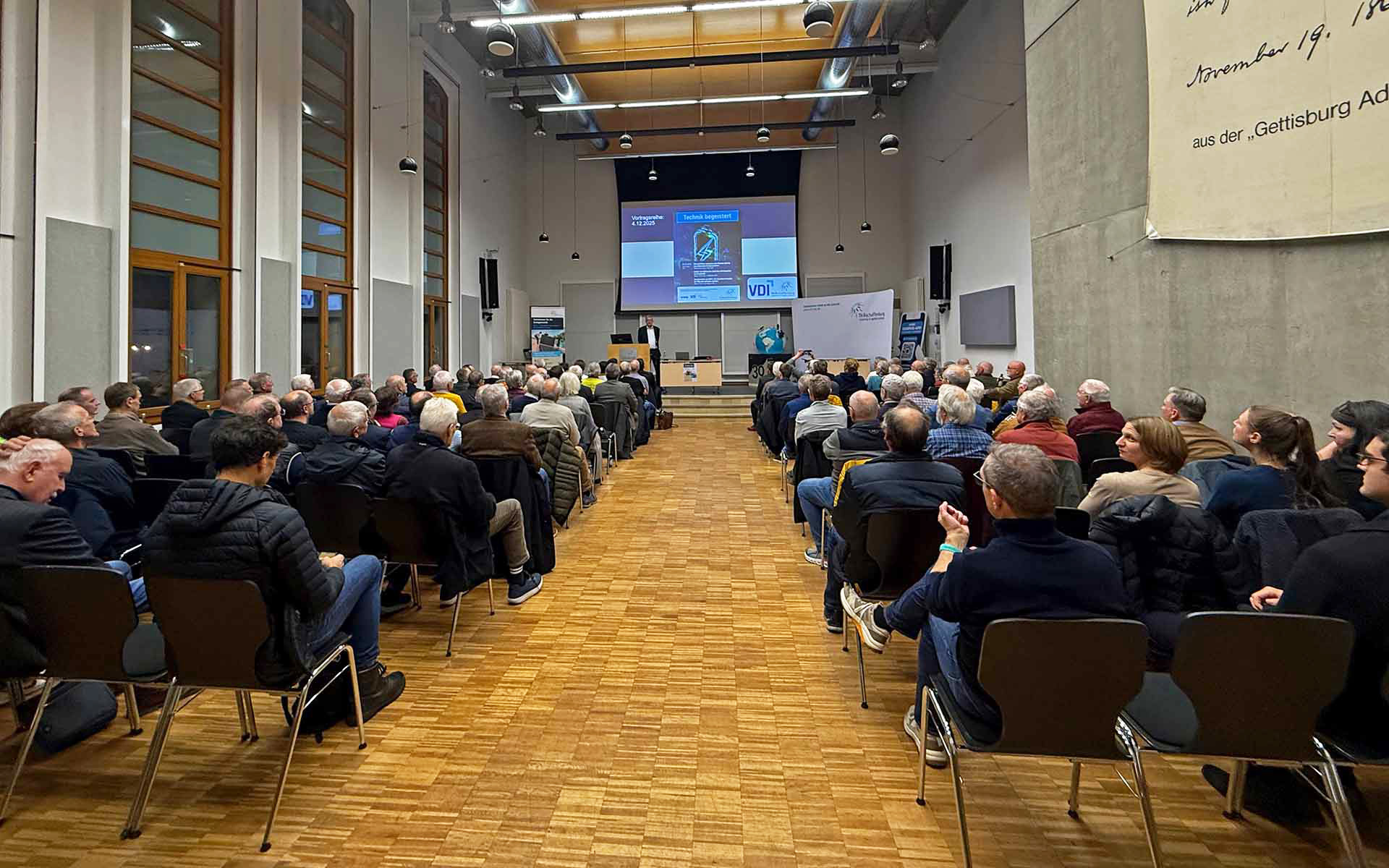 VDI-Bezirksgruppenleiter Markus Grundmann eröffnete die Veranstaltung und begrüßte über 100 Besucherinnen und Besucher in der Aula der TH Aschaffenburg. In drei Fachvorträgen beleuchteten die TH-Experten, Prof. Dr.-Ing. Johannes Teigelkötter, Prof. Dr.-Ing. Michael Mann und Prof. Dr.-Ing. Andreas Vath, anschließend verschiedene Facetten moderner Energiespeicherung.
