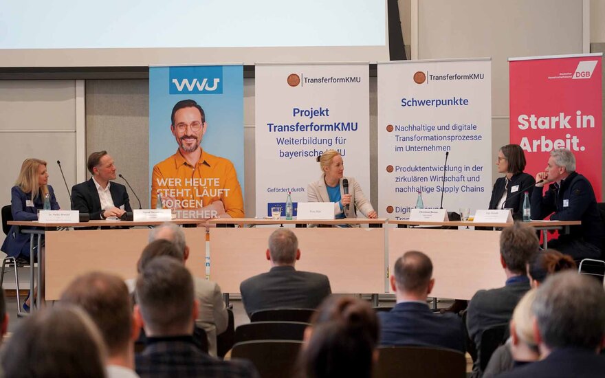 In der anschließenden Podiumsdiskussion, die Katrin Küx vom Bayerischen Rundfunk moderierte, betrachteten Ingo Bazalik (Leiter Aus- und Weiterbildung, Mainsite GmbH & Co. KG), Christiane Benner (Zweite Vorsitzende, IG Metall), Marcel Verweinen (Personalleiter Deutschland, Continental AG) und Dr. Heike Wenzel (CEO, Wenzel Group & Präsidentin IHK Aschaffenburg) das Thema Weiterbildung aus unterschiedlichen Perspektiven.