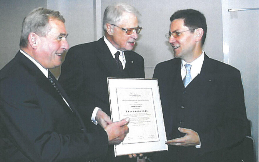 • Verleihung der Würde eines Ehrensenators an Horst Michaels (Mitte), ehemaliger Vorsitzender des Fördervereins, für seine langjährige Unterstützung am 23. November 2001. Neben ihm Günter Dehn (links), damaliger Bürgermeister in Aschaffenburg, und Prof. Dr. Wilfried Diwischek (rechts), damaliger Rektor der Hochschule