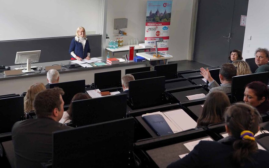 Auch die Frage, wie KMU es mit ihren begrenzten Ressourcen schaffen können, mit großen Unternehmen im Kampf um Fachkräfte mitzuhalten, wurde aufgegriffen. So sei es ein wichtiges Anliegen, Nachwuchskräfte in der Region zu halten und dadurch den regionalen Mittelstand bzw. die regionale Wirtschaft zu stärken. Gerade um dem beständig wachsenden Nachwuchskräftemangel entgegenwirken zu können, betonte TH-Präsidentin Prof. Dr. Eva-Maria Beck-Meuth, wie wichtig es der Hochschule sei, zusammen mit den Unternehmerinnen und Unternehmern aus der Region zu überlegen, was gemeinsam dagegen unternommen werden könne.