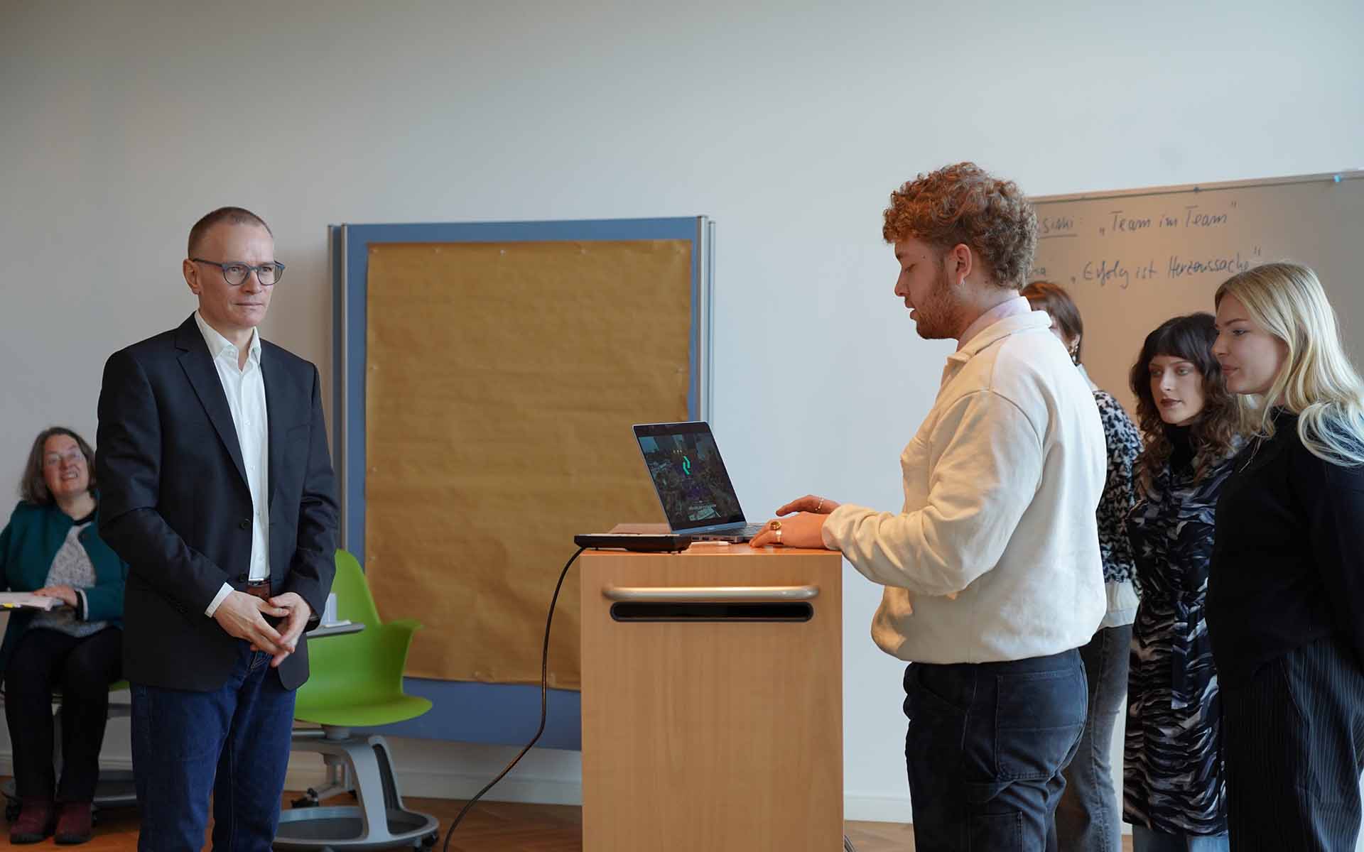 Besonders interessant war in diesem Semester zudem der Brückenschlag zwischen den technischen Modulen, nämlich „Digital Twin“ sowie „Technische Dokumentation“ einerseits und „Kommunikationskonzeption“ andererseits. So konnte sich MKD-Professor Dr.-Ing. Jens Elsebach in das Projekt zu Gunsten der Studierenden einbringen und es gelang immer wieder, modulübergreifend Kontakte und Synergien zu nutzen. Vor diesem Hintergrund wurde die Abschlusspräsentation auch zu einem echten MKD-Event, an dem alle MKD-Absolventinnen und Absolventen, das Unternehmen ekkodale sowie mehrere MKD-Professoren teilnehmen konnten.