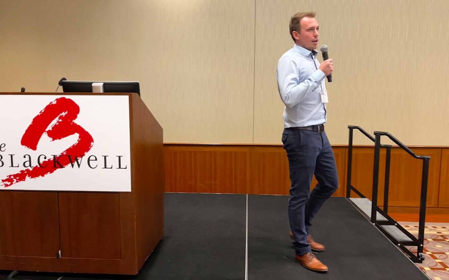 • Doktorand Timm Sauer während seines Vortrags auf der IFAC/ ACC zur KI-basierten automatischen Spurführung von Flurförderzeugen