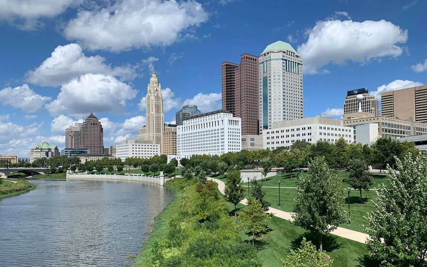 • Die Skyline von Columbus. Die Ohio State University hat ihren Hauptcampus in Columbus und gilt als eine der größten Universitäten der USA.