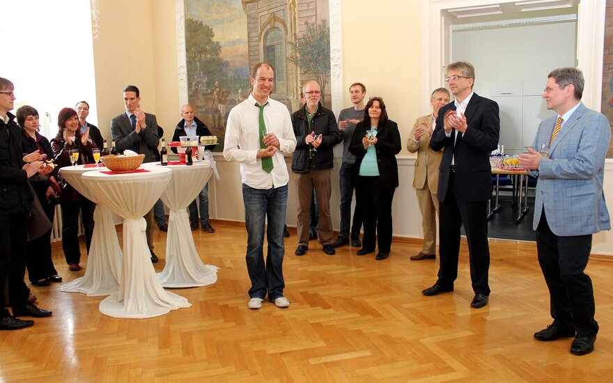 • Andreas Daus bei seiner Doktorfeier im Hock-Saal - auch Präsident Prof. Dr. Wilfried Diwischek (1.v.r.) Vizepräsident Forschung Prof. Dr. Hans-Georg Stark (2.v.r.) und Kanzler Gerhard Sarich (3.v.r.) gratulieren