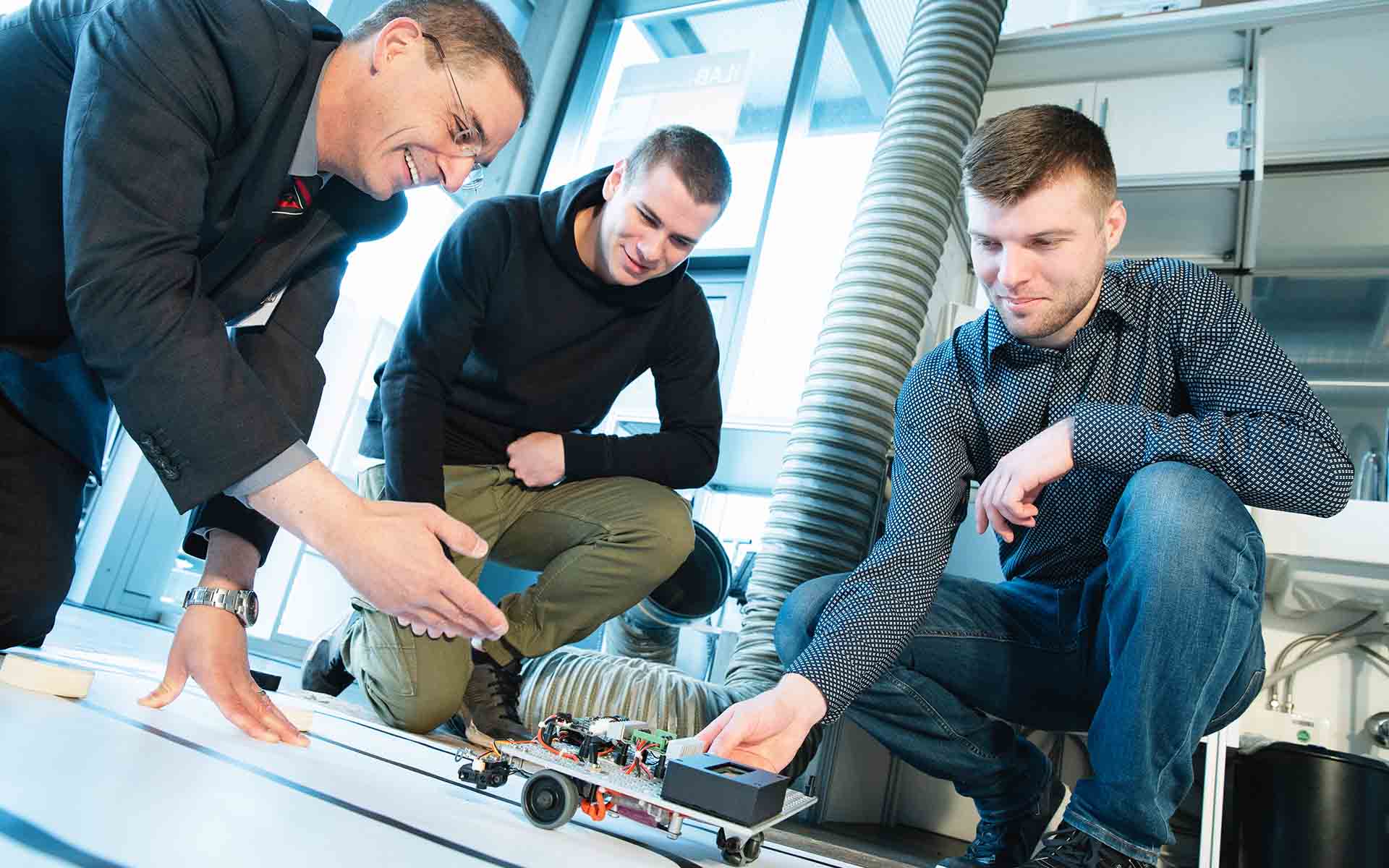 Im Labor gibt es einen Testbereich, in dem kleine mobile Roboter in einer standardisierten Umgebung untersucht werden können. Die kommerziell verfügbaren Roboter werden individuell erweitert - z.B. mit Funkkommunikation oder Laser-Sensorik.