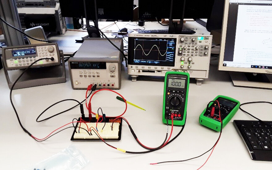 Im Grundlagenpraktikum bauen Studierende Schaltungen auf, die sie zuvor am Computer simuliert haben. Die Funktionalität überprüfen sie mit modernster Messtechnik. So wird ein Rundumverständnis für die eingesetzten Bauelemente geschaffen.