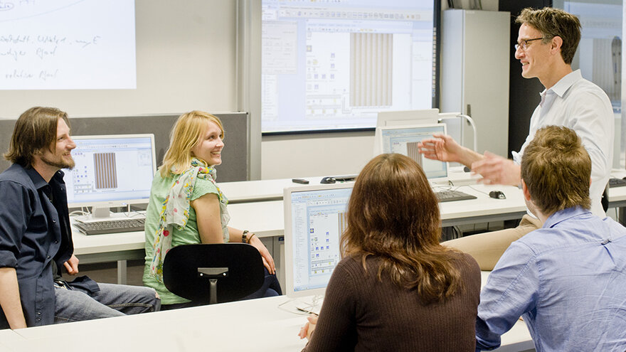 Außerdem gibts Tutorien, also meist in einer kleineren Gruppe abgehaltene, ergänzende Übungen, die entweder in Präsenz oder als Videomeeting stattfinden. Du kannst das Mentoringangebot älterer Studis nutzen und dich auf unserer Online-Lernplattform Moodle durchklicken und ausprobieren. Und noch ein Geheimtipp für dich: Unsere Bibliothek ist ein idealer Ort zum entspannten Lernen und Recherchieren. Unsere Labore und Räume mit PC-Arbeitsplätzen, an denen du mit ausgewählter Software arbeiten kannst, sind für dich geöffnet: Hier kannst du aus trockener Theorie Praxis machen.
